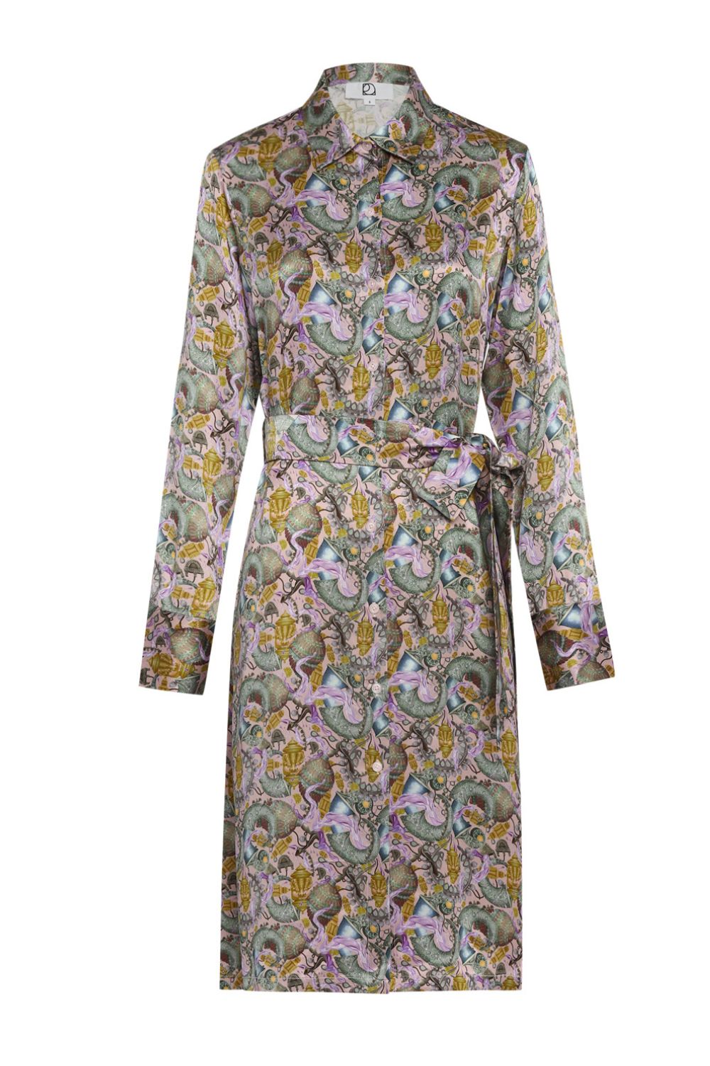 Printed shirt dress in pure mulberry silk satin for a weightless fit.