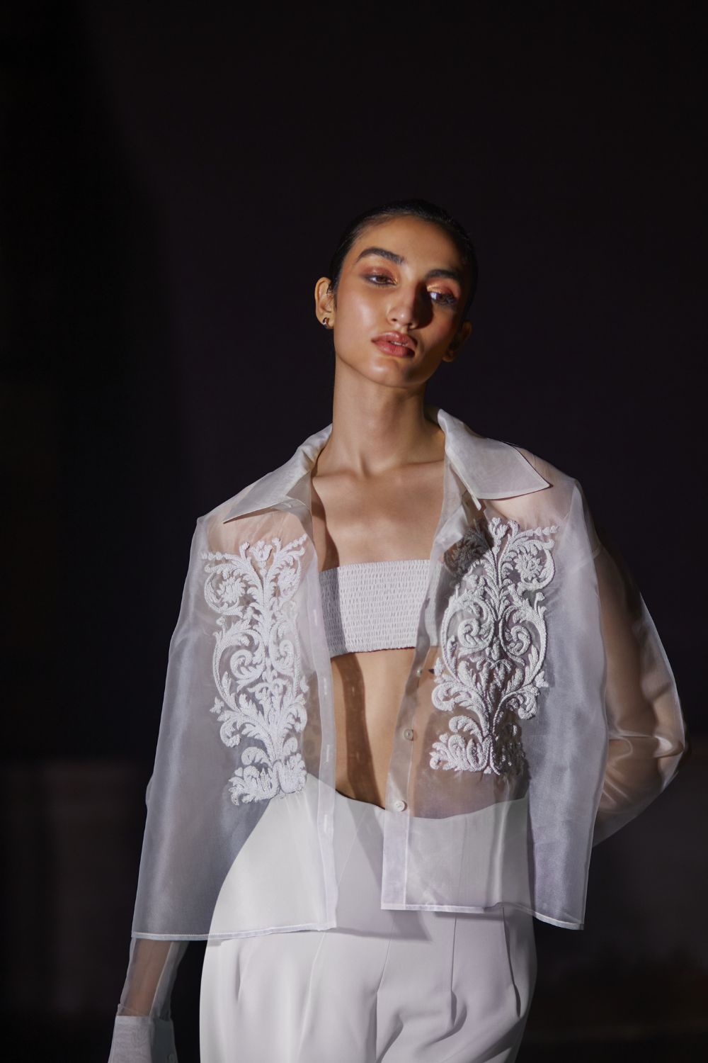 Sheer mulberry silk organza shirt accented with adroit embroidery by hand over 12 days.