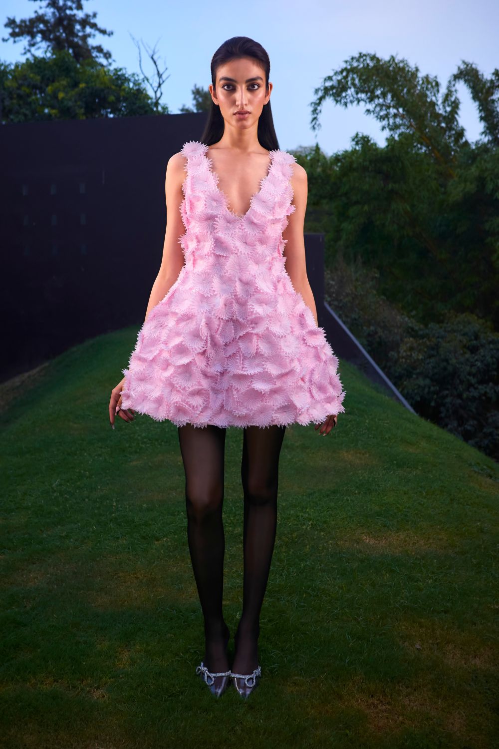 Front Layered Dress adorned with relief embroidered sunflowers washed in dainty pink.